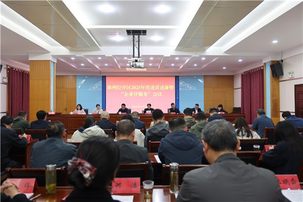 4月16日,池州经开区召开2025年度述责述廉暨“企业评服务”会议,区党工委委员、纪检监察工委书记刘杰主持评议并讲话。会上,经济发展局、建设局、社会事务局、综合执法大队、市场监管局、安徽平天湖投资控股集团有限公司主要负责同志分别口头述责述廉,并现场回答了区纪检监察工委委员提问。会议邀请廉政特邀监督员、非公企业代表对区直各单位为企服务工作进行测评。